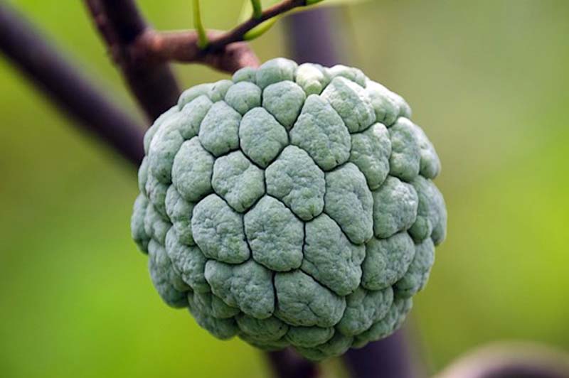 A fruta-do-conde tem uma casca verde ou verde-amarelada que é composta por segmentos arredondados, parecendo pequenas “escamas”. A polpa é branca, cremosa e doce, cheia de sementes pretas.